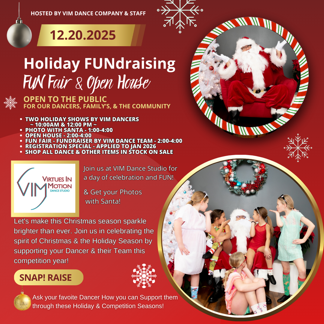 VIM Dance Company along with all of Virtues In Motion Dance Studio Dancers, will showcase their talents alongside some holiday spirit in this fun annual show & fun fair!